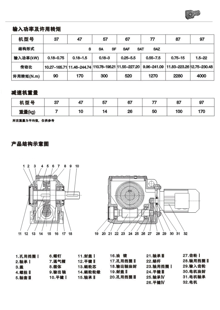 S斜齒輪蝸桿減速機輸入功率及許用轉(zhuǎn)矩、減速機重量、產(chǎn)品內(nèi)部結構示意圖