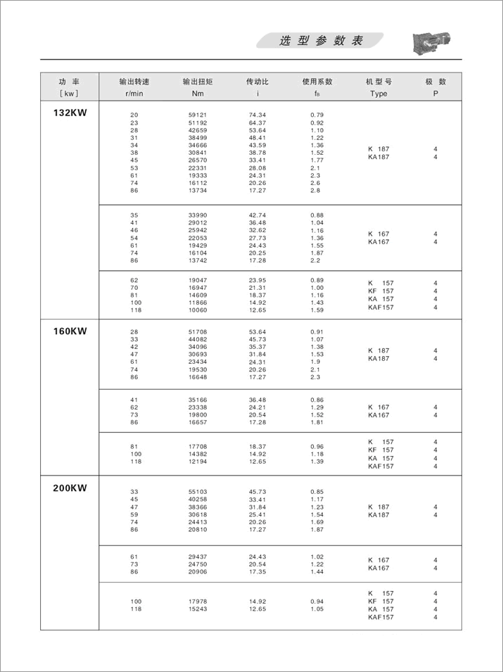K螺旋錐齒輪減速機選項參數(shù)表90KW、110KW、132KW、160KW、200KW