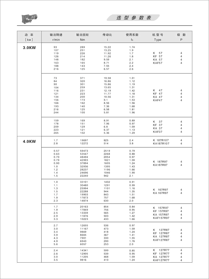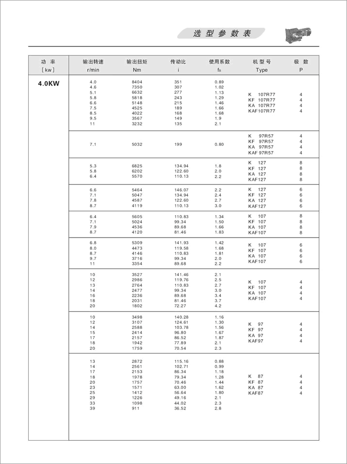 K螺旋錐齒輪減速機選項參數表4.0KW